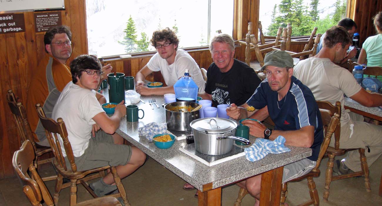 Your guide stays for free and clients pay CAD $25 each per night. The hut sells out in high season (mid-July to end of August) and we recommend reserving as early as possible. The alternatives are to stay at the Applebee and Boulder campgrounds ($10/person), but they make for a longer approach with heavier packs.